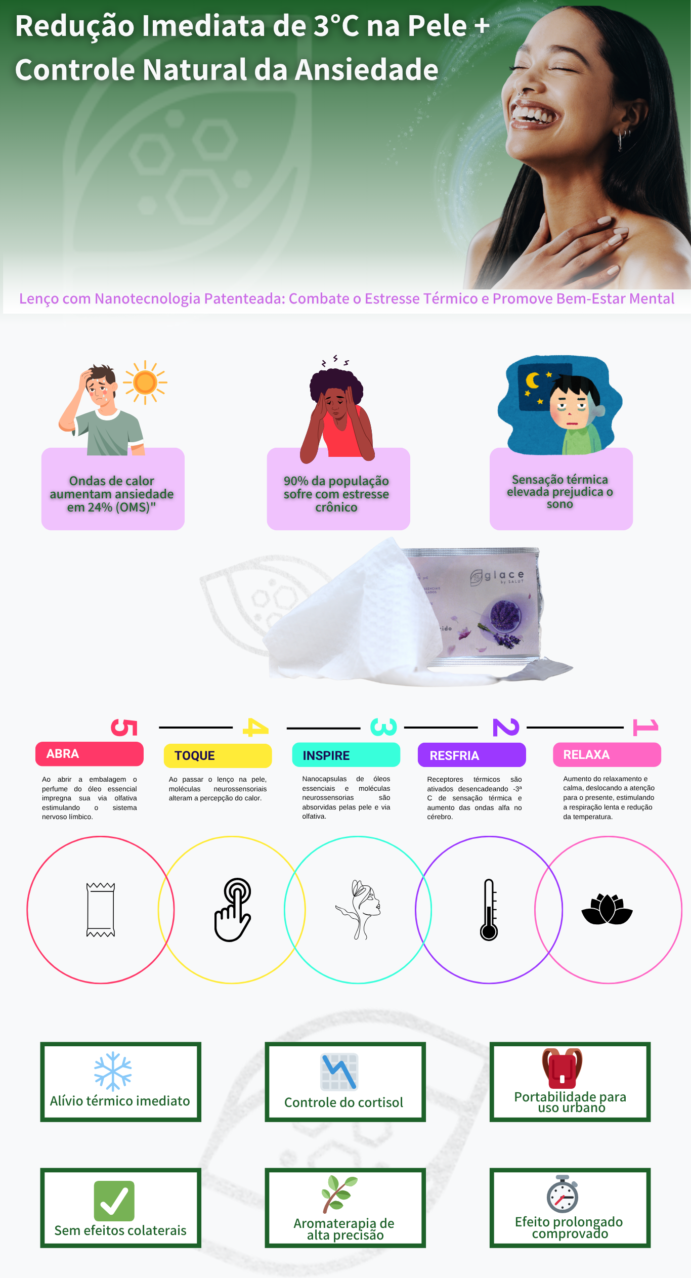 Imagine reduzir a sensação térmica da sua pele em até 3°C com um simples toque. O Glace não é apenas um lenço umedecido - é uma revolução biotecnológica de bem-estar que cabe no seu bolso.